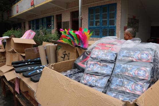 公司員工捐贈(zèng)的書包體育用品等物資